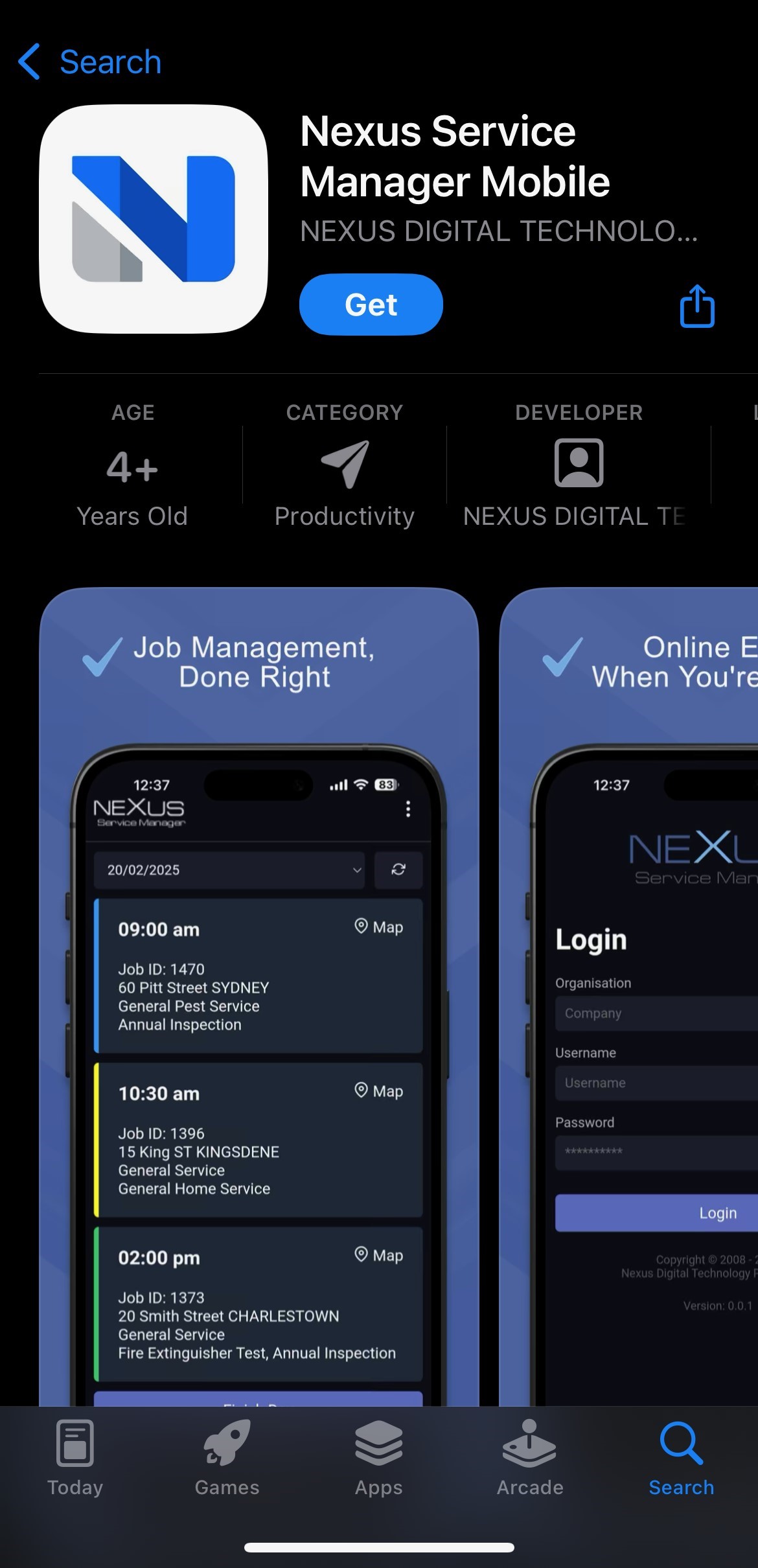 - Type in the search bar "nexus service manager mobile" and click into the download page.