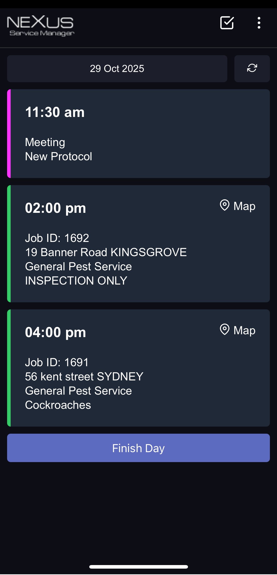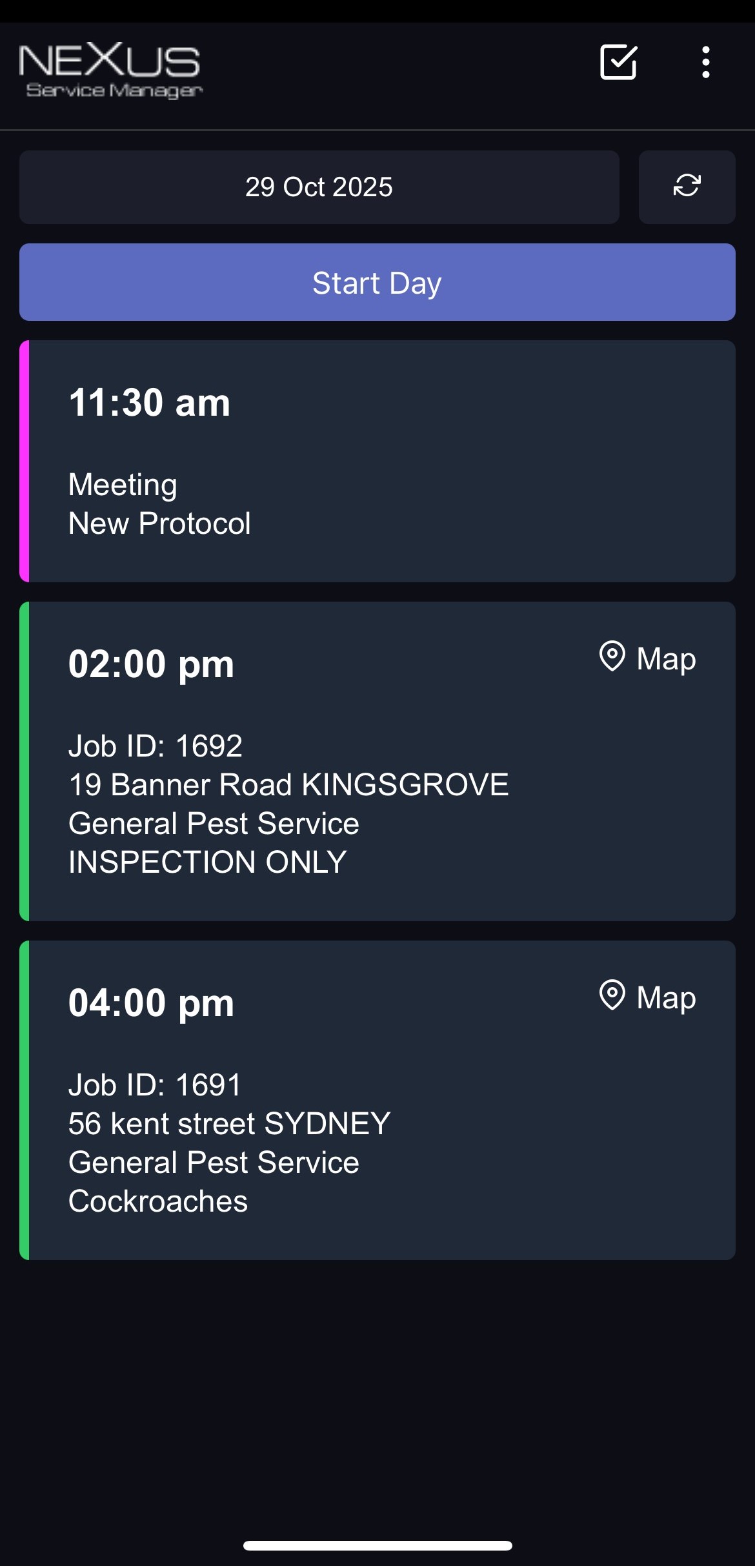 A "Start Day" and "Finish Day" button may be available depending on system settings. This records when the day is started and finished. The technician should click "Start Day" when they start traveling to their first job or when they leave their office.
