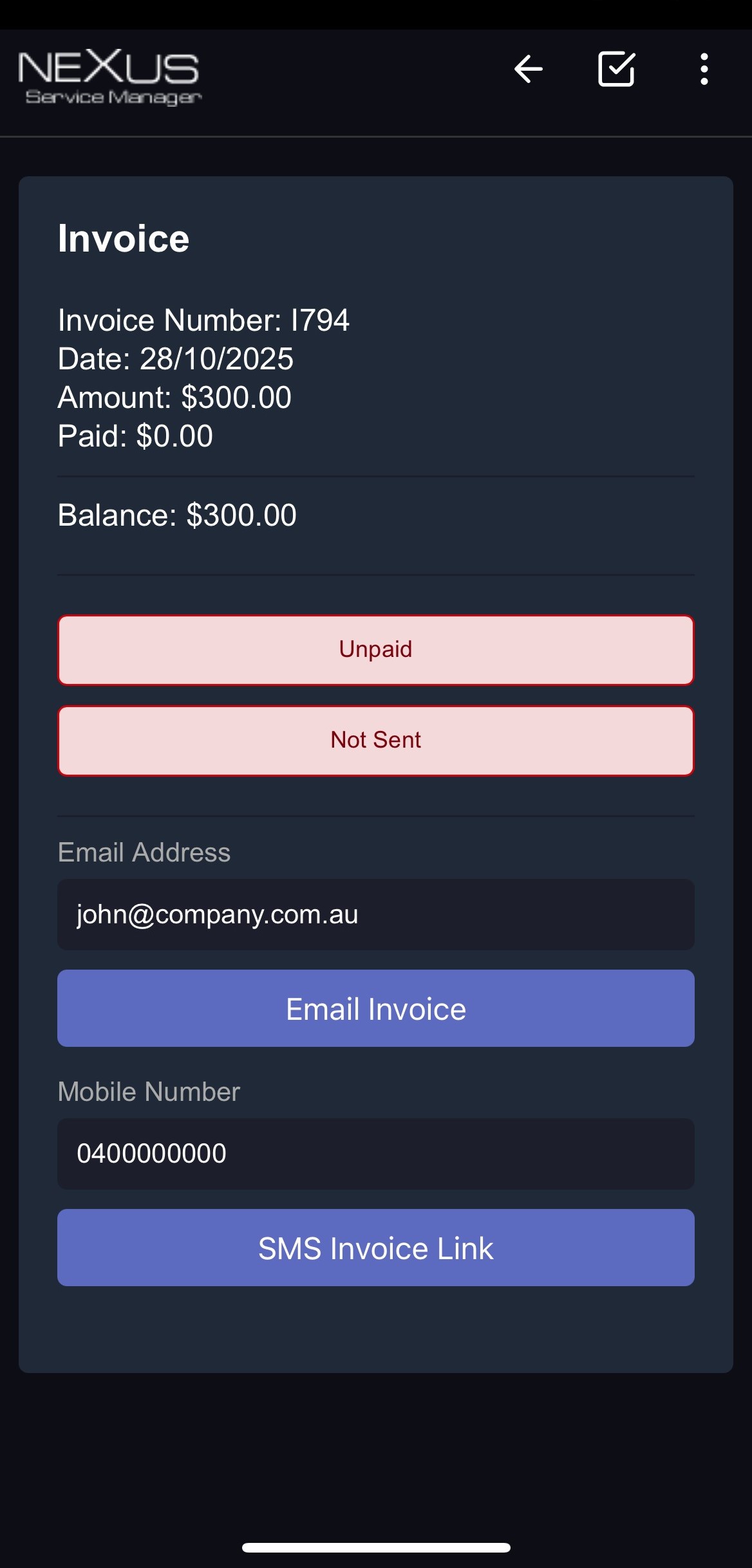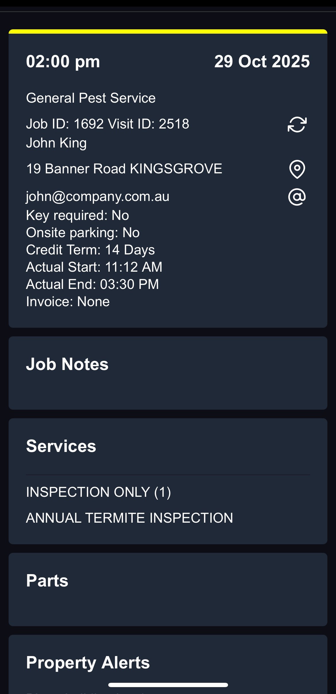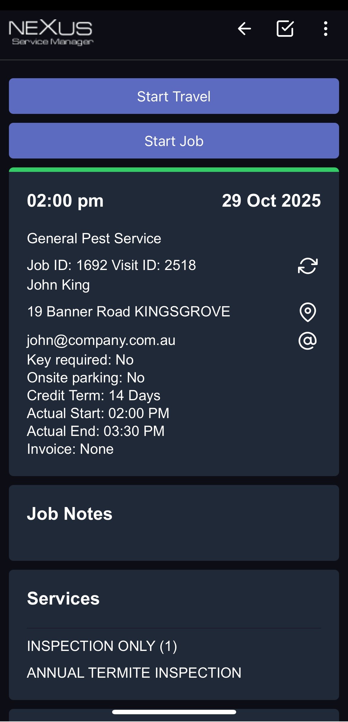 When the technician want to start the job, click "Start Job" this will time stamp the job and update the job status from Scheduled to In progress changing the colour of the job in the mobile app and also in the office.