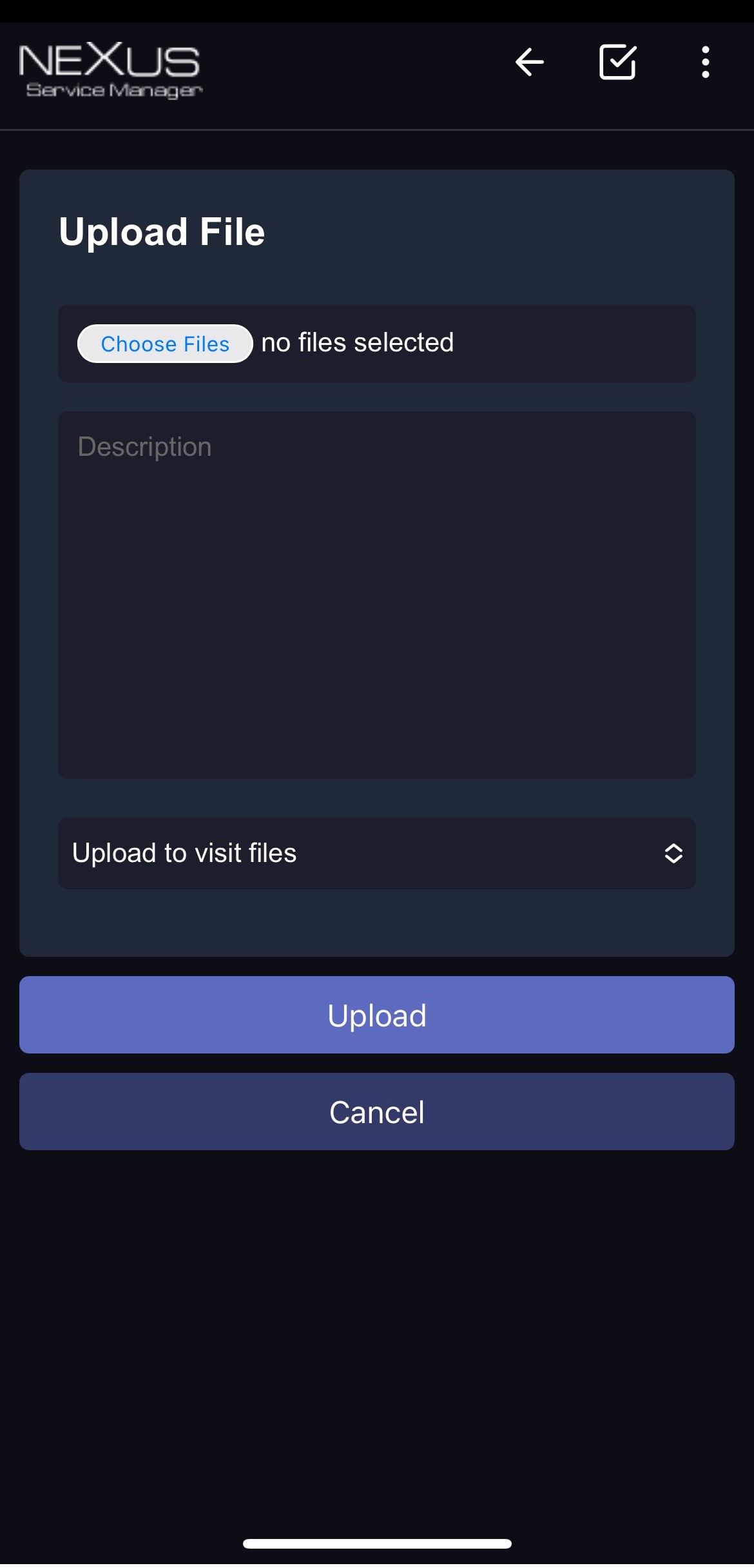 To add a new photo or file press the plus sign on the right and a new screen will display with the options to select a file and enter in a description. When you press "Choose File" in android or iOS the device will ask you to use Gallery or Camera, ether take or new photos or select the photos you want to upload.