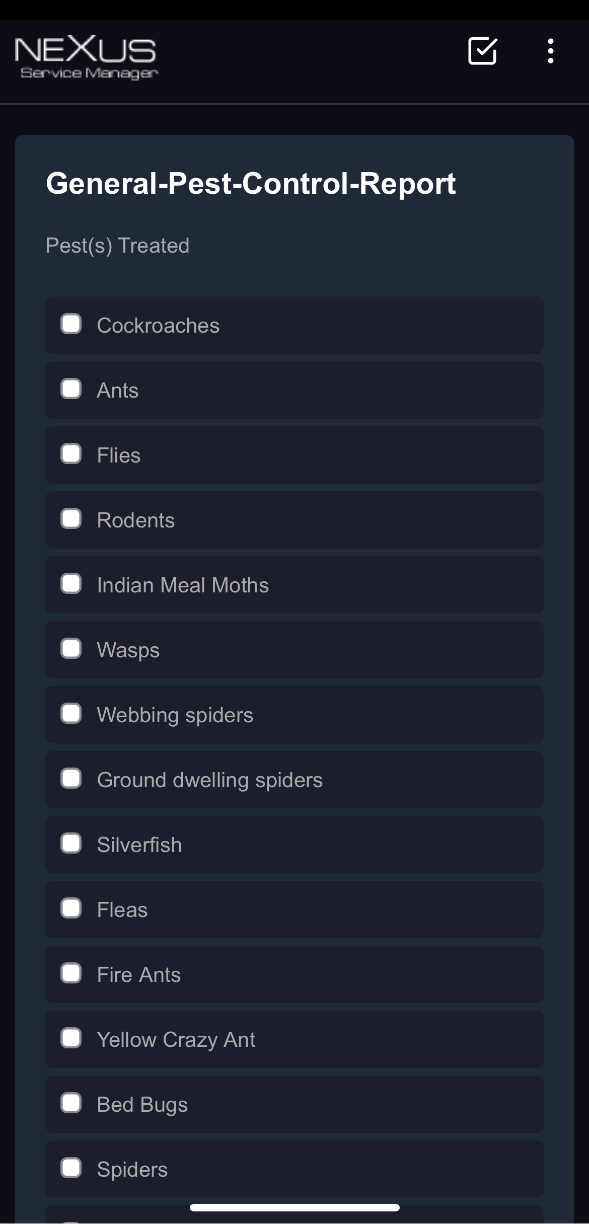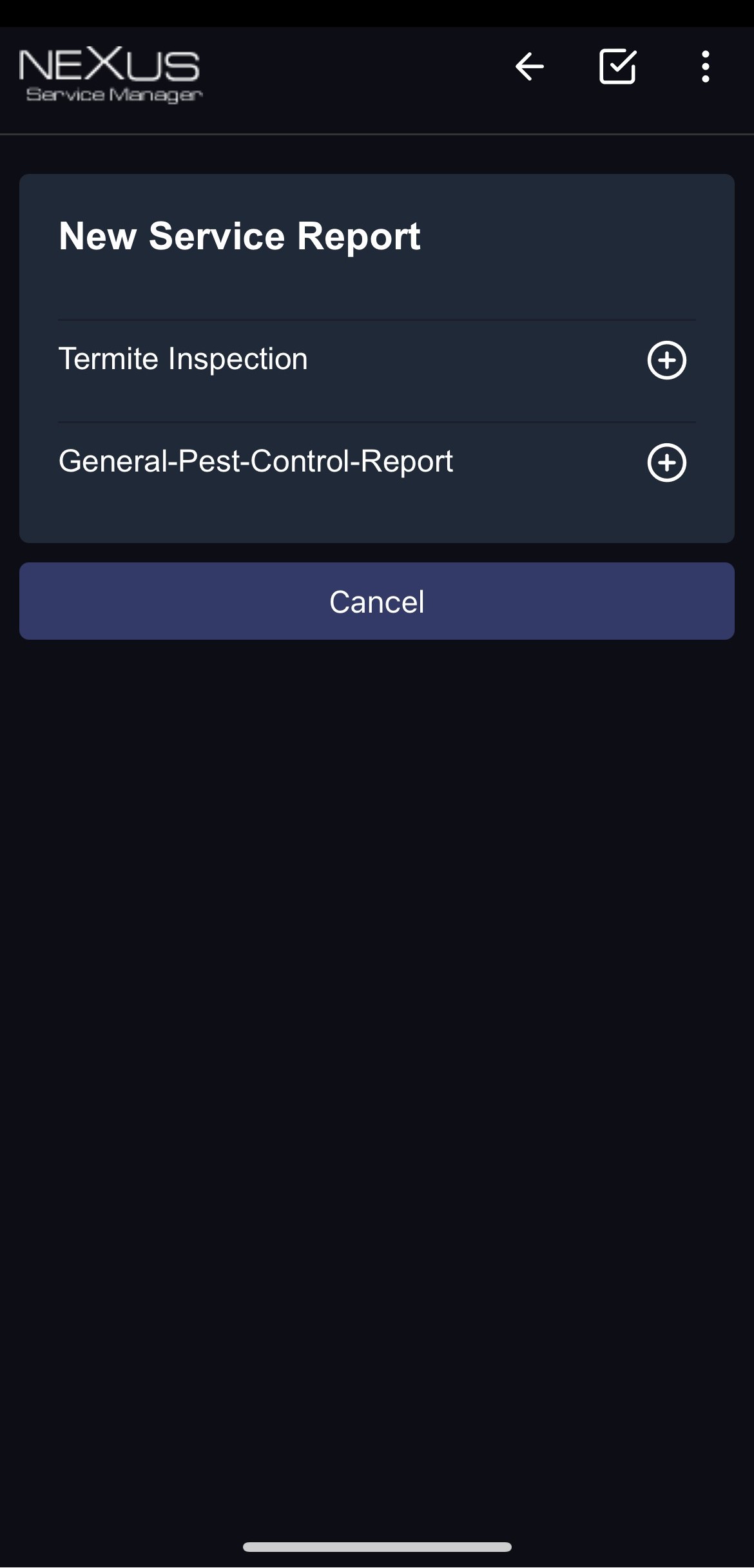 To complete a service report press Service Reports and then select the service report you want to complete. The available service reports will be depending on what services are booked in.