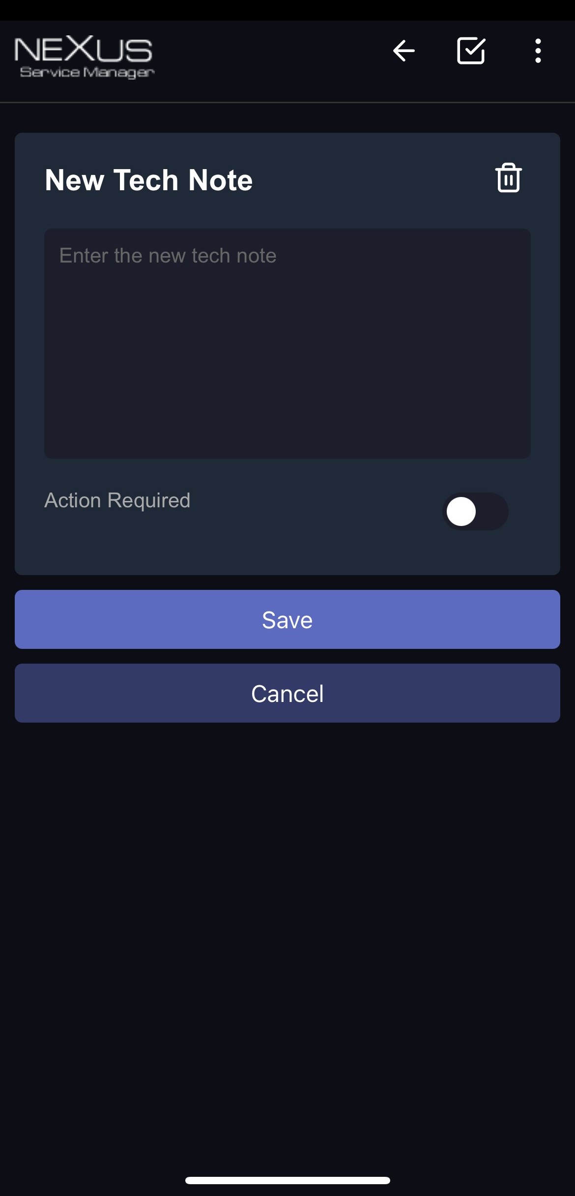 Technicians can enter any many Tech Notes as required. One tech note is normally set as a minimum to complete a job. To enter a new Tech Note, press Tech Notes and press the plus sign on the right hand side beside the title.