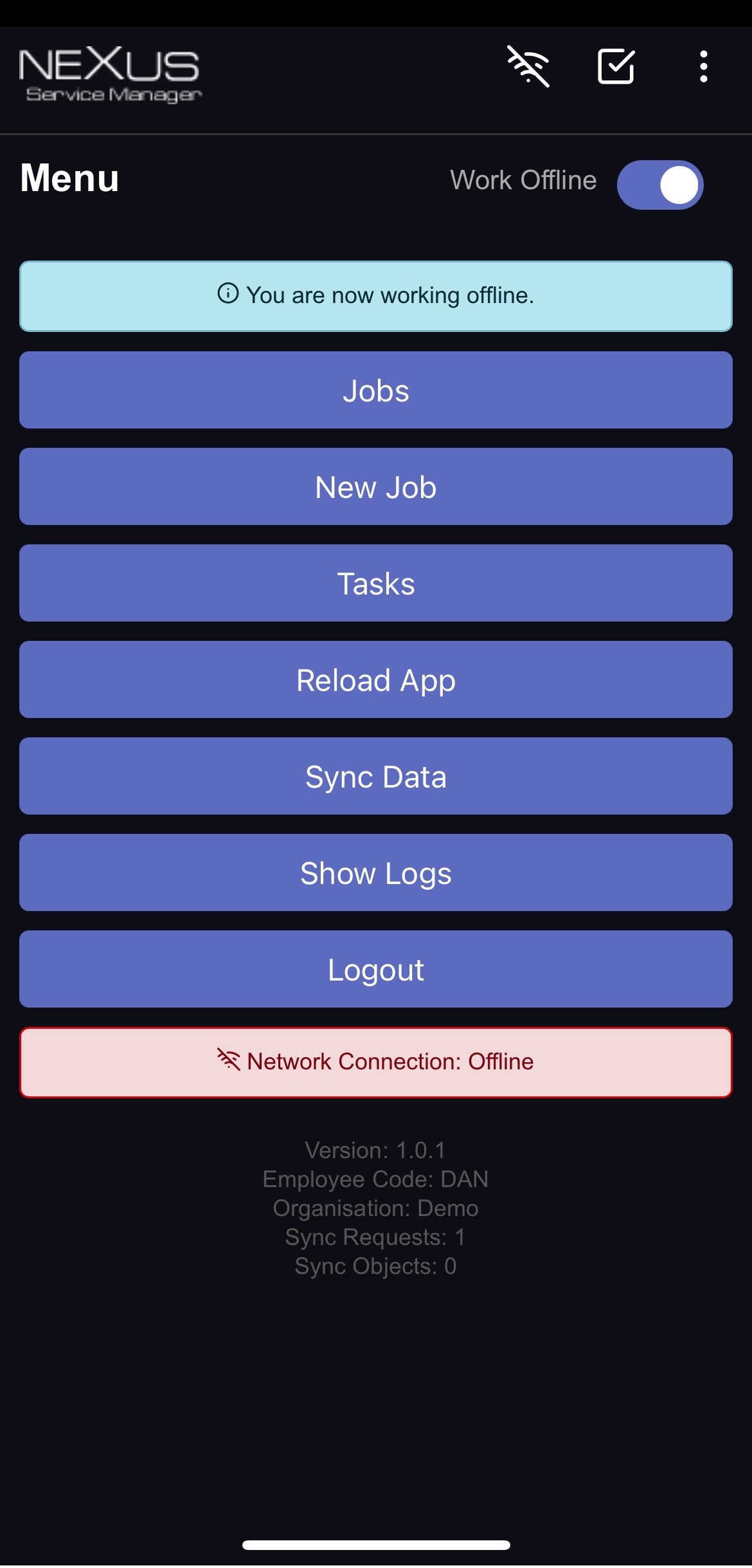 To work offline click the three dots in the top right corner, and click "Work Offline" to enable the system to work offline.